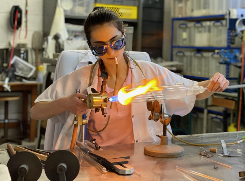 Besoin d’un réfrigérant neuf ? Nécessité de modifier un ballon ? Un bécher et une éprouvette cassés ? Une nouvelle colonne à imaginer ? Vous êtes à la bonne porte ! À l’ENSCL, une souffleuse de verre fait en sorte de répondre à vos besoins en verrerie de laboratoire, grâce à sa maitrise, son savoir-faire et son chalumeau !
