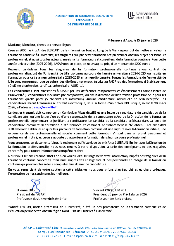 - Madame Delphine MONTFROY, inscrite en Master 2, Sciences de l’éducation et de la formation, parcours Ingénieries et transformations de la formation des adultes, à la Faculté de Psychologie et des Sciences de l'Éducation et de la Formation (PsySEF).