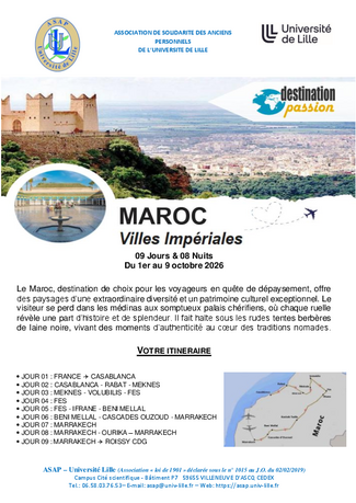 La Commission voyages a le plaisir de vous proposer un voyage au Maroc. Départ le 1er octobre 2026 pour un séjour 8 jours / 7 nuits. Attention, date limite d'inscription le 13 Mars 2026.